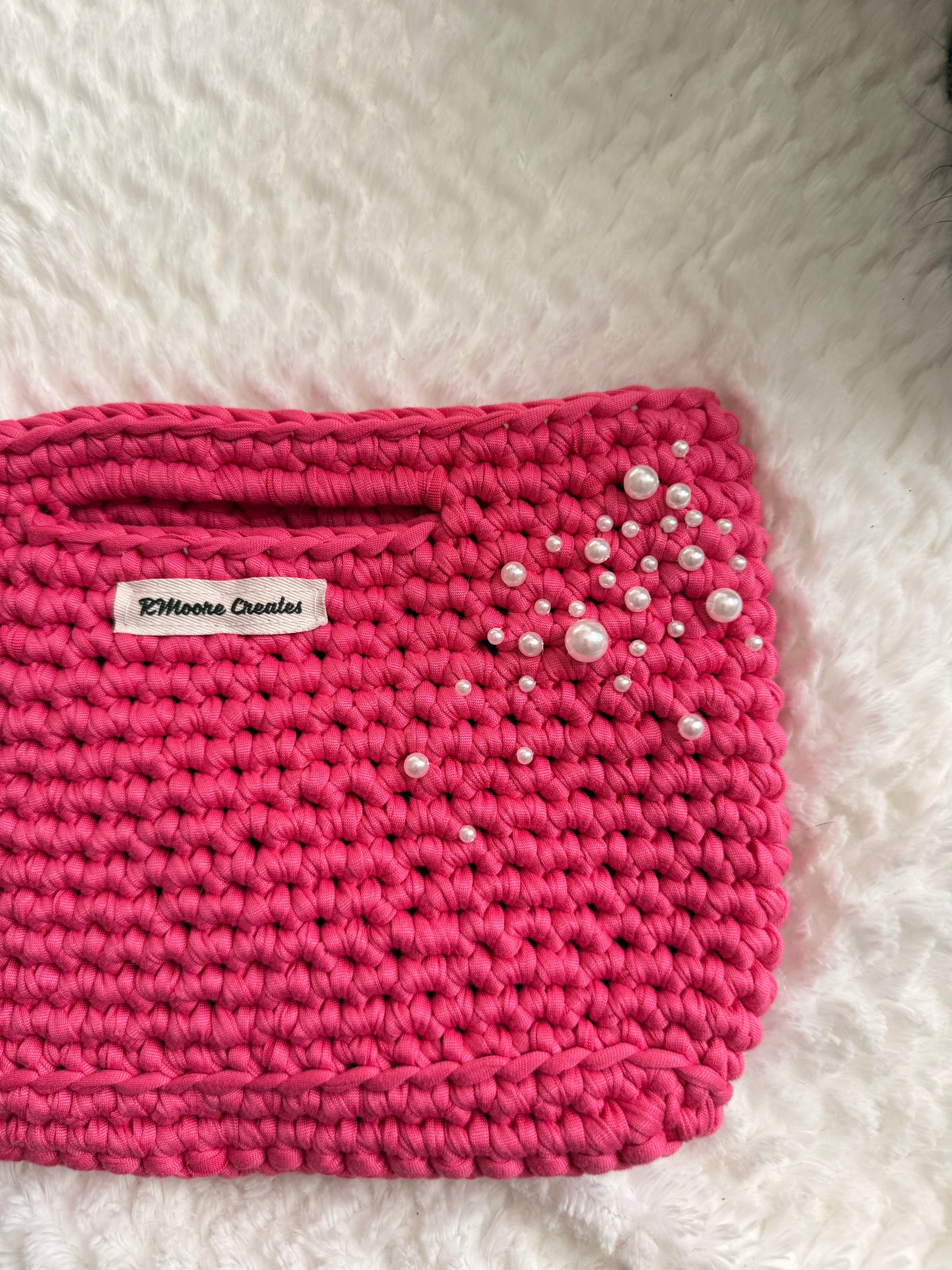 Delicately placed pearls create a bougie vibe that contrasts beautifully with the chunky crochet texture. The built-in handle makes it easy to carry as a clutch or tuck under your arm for a chic effortless look.